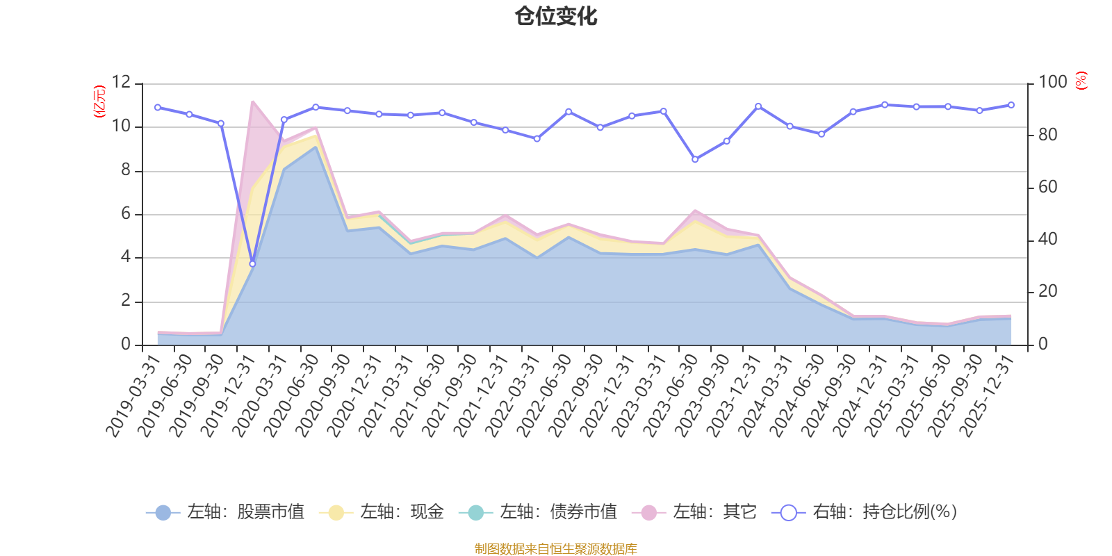 据定期报告数据统计,近三年平均股票仓位为86.54%,同类平均为72.57%。2024年末基金达到91.86%的最高仓位,2019年末最低,为31.03%。