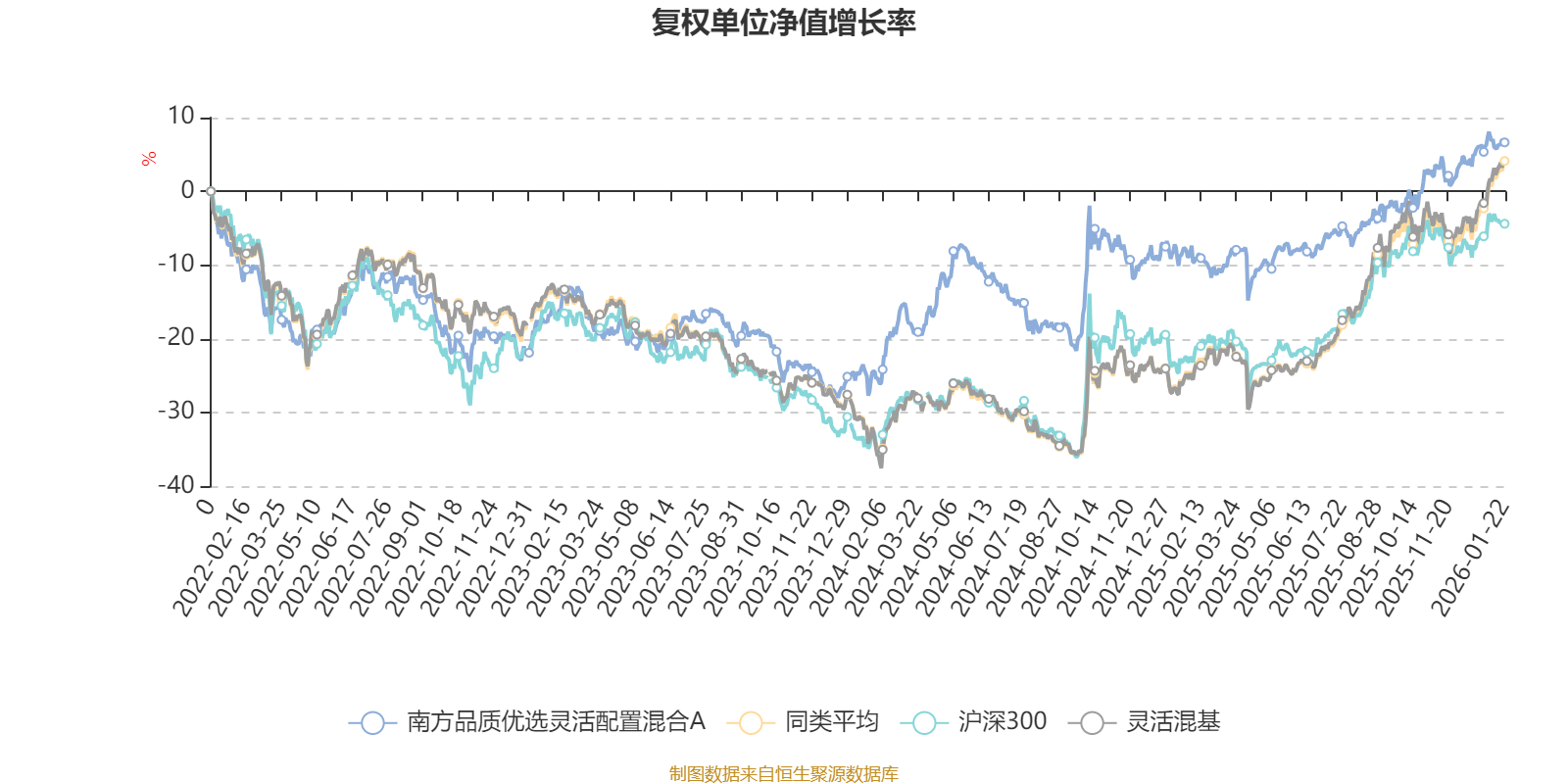 截至1月22日,南方品质优选灵活配置混合A近三个月复权单位净值增长率为6.89%,位于同类可比基金752/1286;近半年复权单位净值增长率为11.92%,位于同类可比基金887/1286;近一年复权单位净值增长率为17.10%,位于同类可比基金990/1286;近三年复权单位净值增长率为29.58%,位于同类可比基金392/1286。