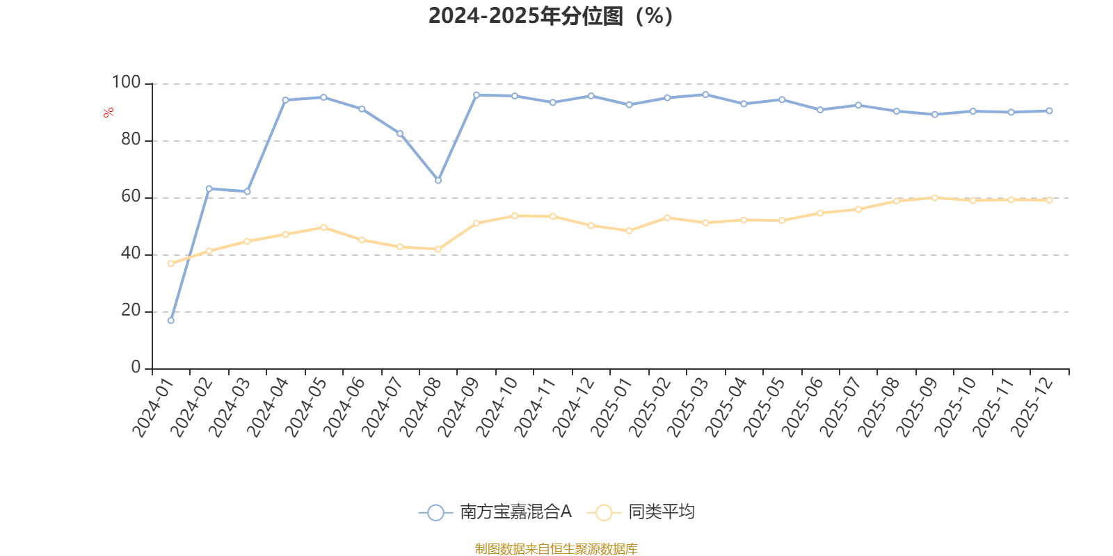 通过所选区间该基金净值增长率分位图,可以观察该基金与同类基金业绩比较情况。图为坐标原点到区间内某时点的净值增长率在同类基金中的分位数。