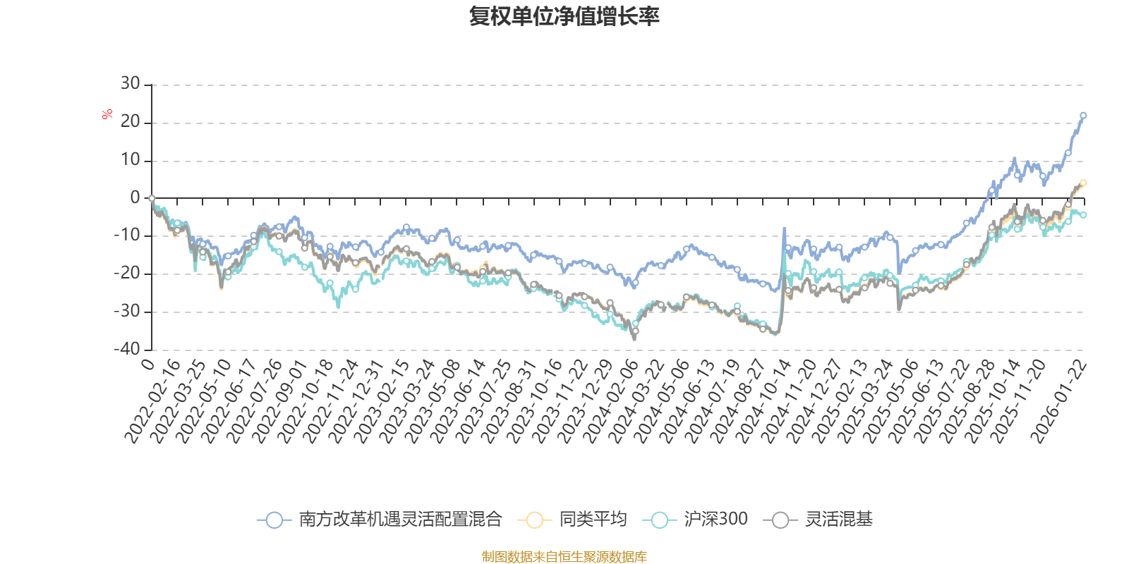 截至1月22日,南方改革机遇灵活配置混合近三个月复权单位净值增长率为15.02%,位于同类可比基金288/1286;近半年复权单位净值增长率为30.39%,位于同类可比基金434/1286;近一年复权单位净值增长率为40.95%,位于同类可比基金498/1286;近三年复权单位净值增长率为34.57%,位于同类可比基金328/1286。