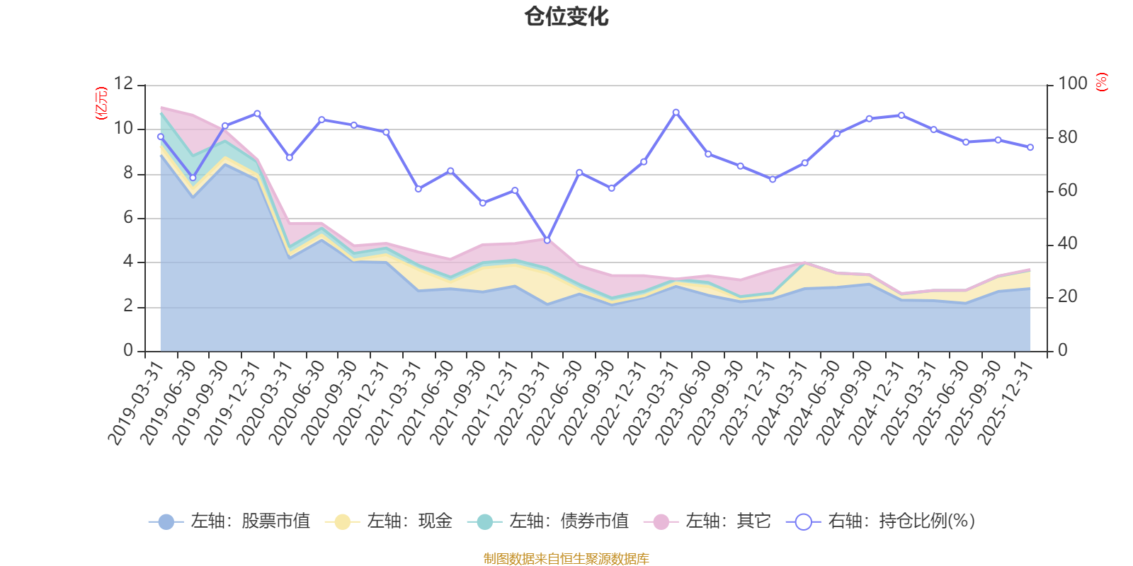 据定期报告数据统计,近三年平均股票仓位为78.66%,同类平均为72.57%。2023年一季度末基金达到89.72%的最高仓位,2022年一季度末最低,为41.63%。
