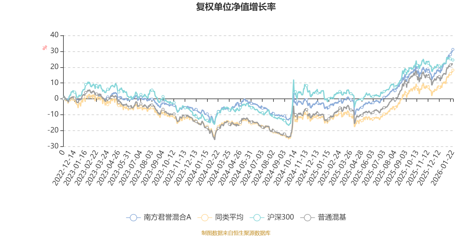 截至1月22日,南方君誉混合A近三个月复权单位净值增长率为13.11%,位于同类可比基金34/134;近半年复权单位净值增长率为25.17%,位于同类可比基金48/134;近一年复权单位净值增长率为36.07%,位于同类可比基金45/131;近三年复权单位净值增长率为29.97%,位于同类可比基金37/124。
