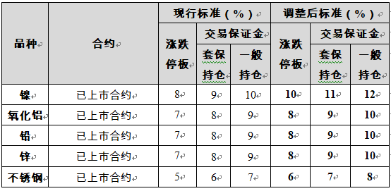 氧化铝、铅、锌期货已上市合约的涨跌停板幅度调整为8%,套保持仓交易保证金比例调整为9%,一般持仓交易保证金比例调整为10%;