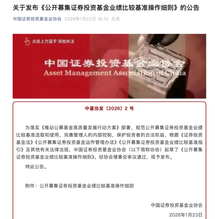 此外,同日,中国证券投资基金业协会发布《公开募集证券投资基金业绩比较基准操作细则》,共六章二十八条,自2026年3月1日起施行。