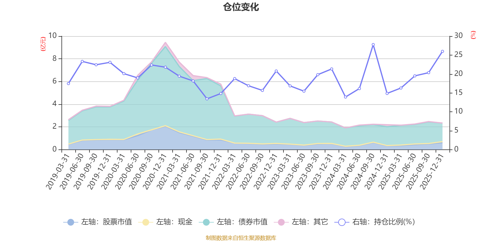 基金管理人在四季报中表示,投资运作方面,考虑十五五开年稳增长政策有望加码,反内卷政策下上游商品开始涨价,同时年初春季躁动行情即将启动,四季度卖出长端利率债,降低组合久期,置换为中短久期信用债品种。转债方面,适当降低仓位,减持高估值高价转债。股票投资方面,维持科技为主的持仓结构,关注 AI 应用端机器人和智能驾驶的实质性落地。同时加仓非银、有色板块,提前布局春季躁动行情。四季度末持仓占比较高的行业包括电子、汽车、化工、非银金融、有色金属。