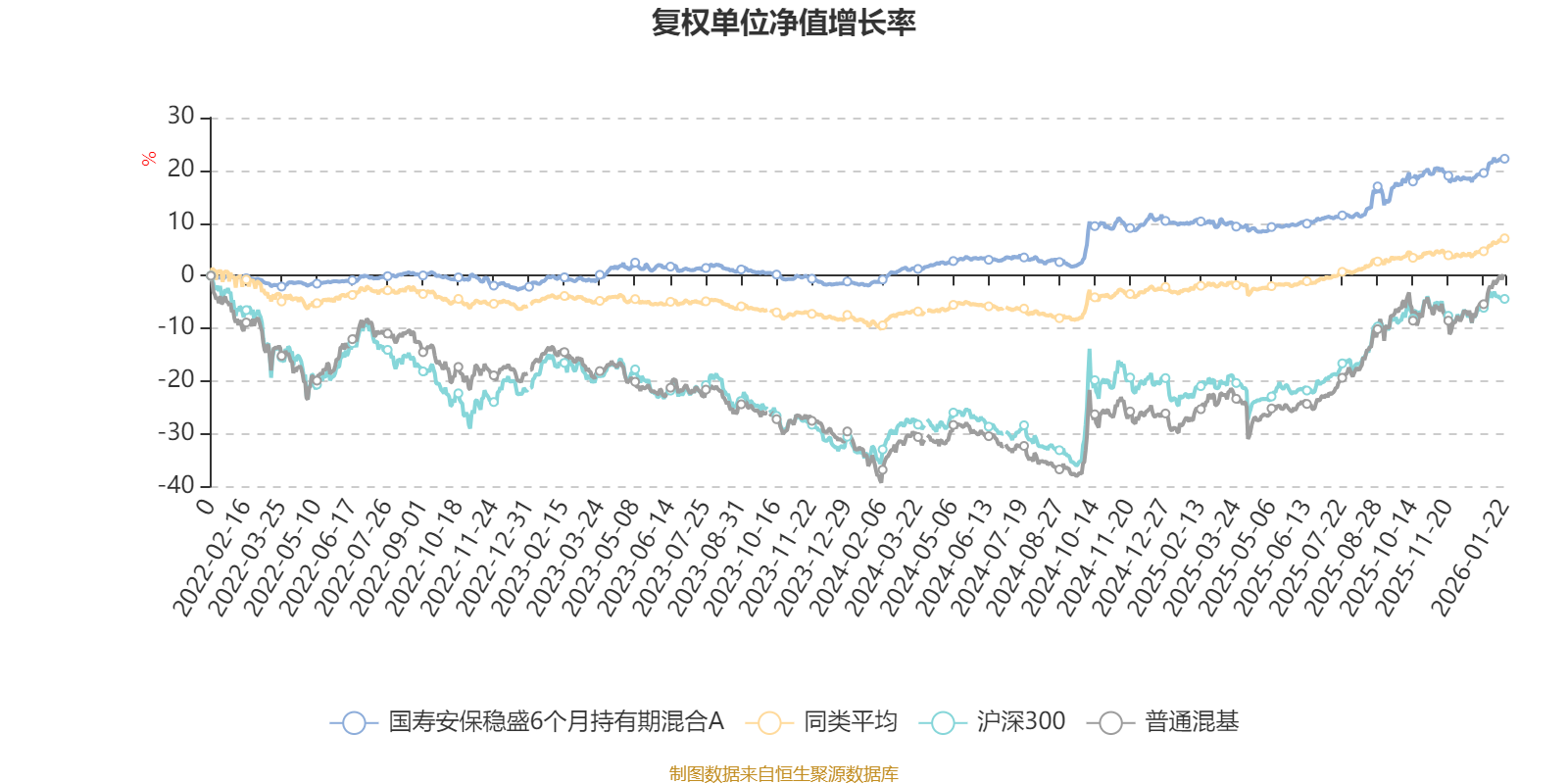 截至1月22日,国寿安保稳盛6个月持有期混合A近三个月复权单位净值增长率为2.71%,位于同类可比基金230/629;近半年复权单位净值增长率为9.66%,位于同类可比基金78/629;近一年复权单位净值增长率为11.13%,位于同类可比基金172/626;近三年复权单位净值增长率为22.43%,位于同类可比基金62/564。