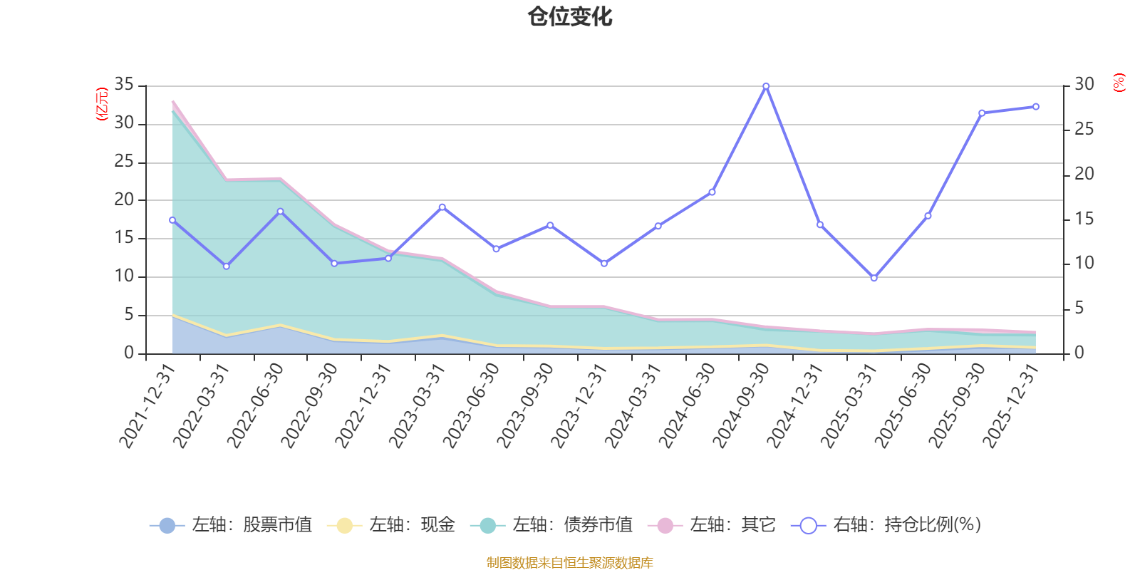 据定期报告数据统计,近三年平均股票仓位为17.32%,同类平均为19.2%。2024年三季度末基金达到29.93%的最高仓位,2025年一季度末最低,为8.47%。