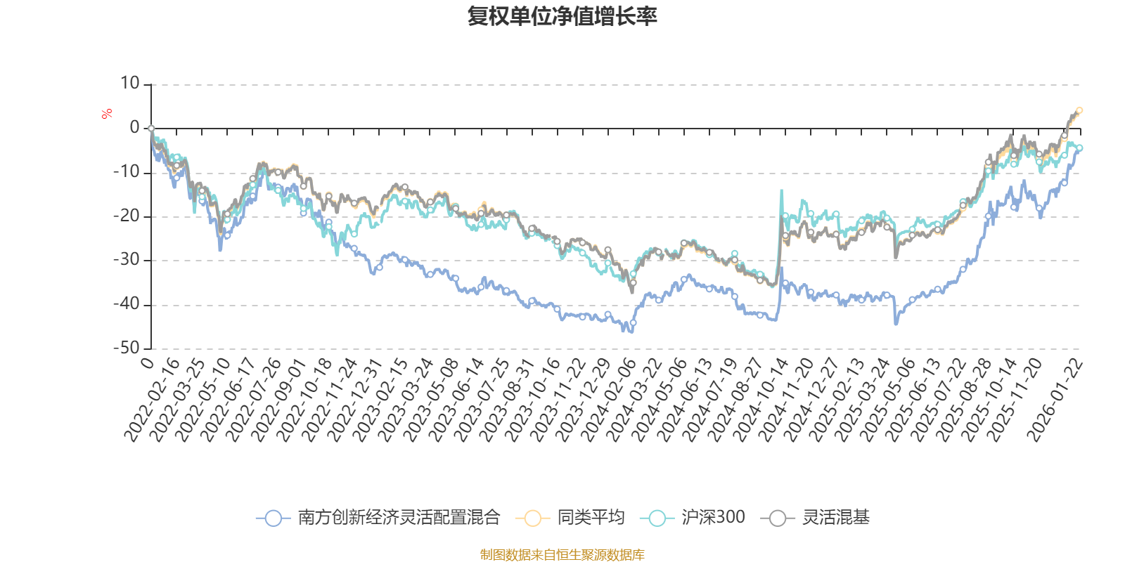 截至1月22日,南方创新经济灵活配置混合近三个月复权单位净值增长率为14.62%,位于同类可比基金304/1286;近半年复权单位净值增长率为40.36%,位于同类可比基金262/1286;近一年复权单位净值增长率为53.83%,位于同类可比基金288/1286;近三年复权单位净值增长率为33.04%,位于同类可比基金346/1286。