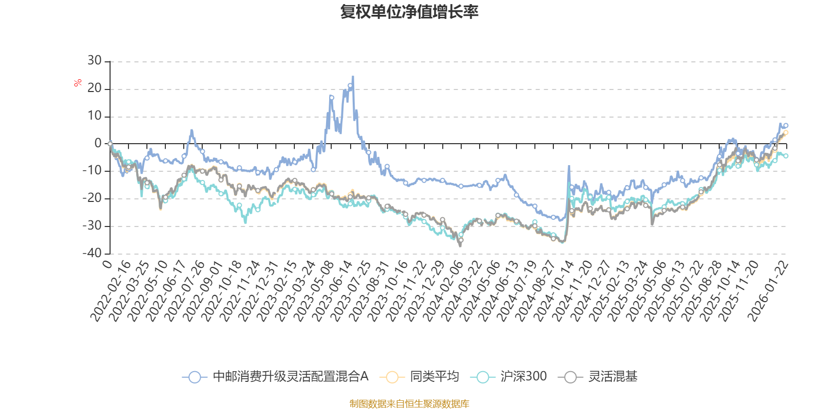 截至1月22日,中邮消费升级灵活配置混合A近三个月复权单位净值增长率为10.04%,位于同类可比基金570/1286;近半年复权单位净值增长率为21.71%,位于同类可比基金643/1286;近一年复权单位净值增长率为29.20%,位于同类可比基金714/1286;近三年复权单位净值增长率为13.17%,位于同类可比基金715/1286。