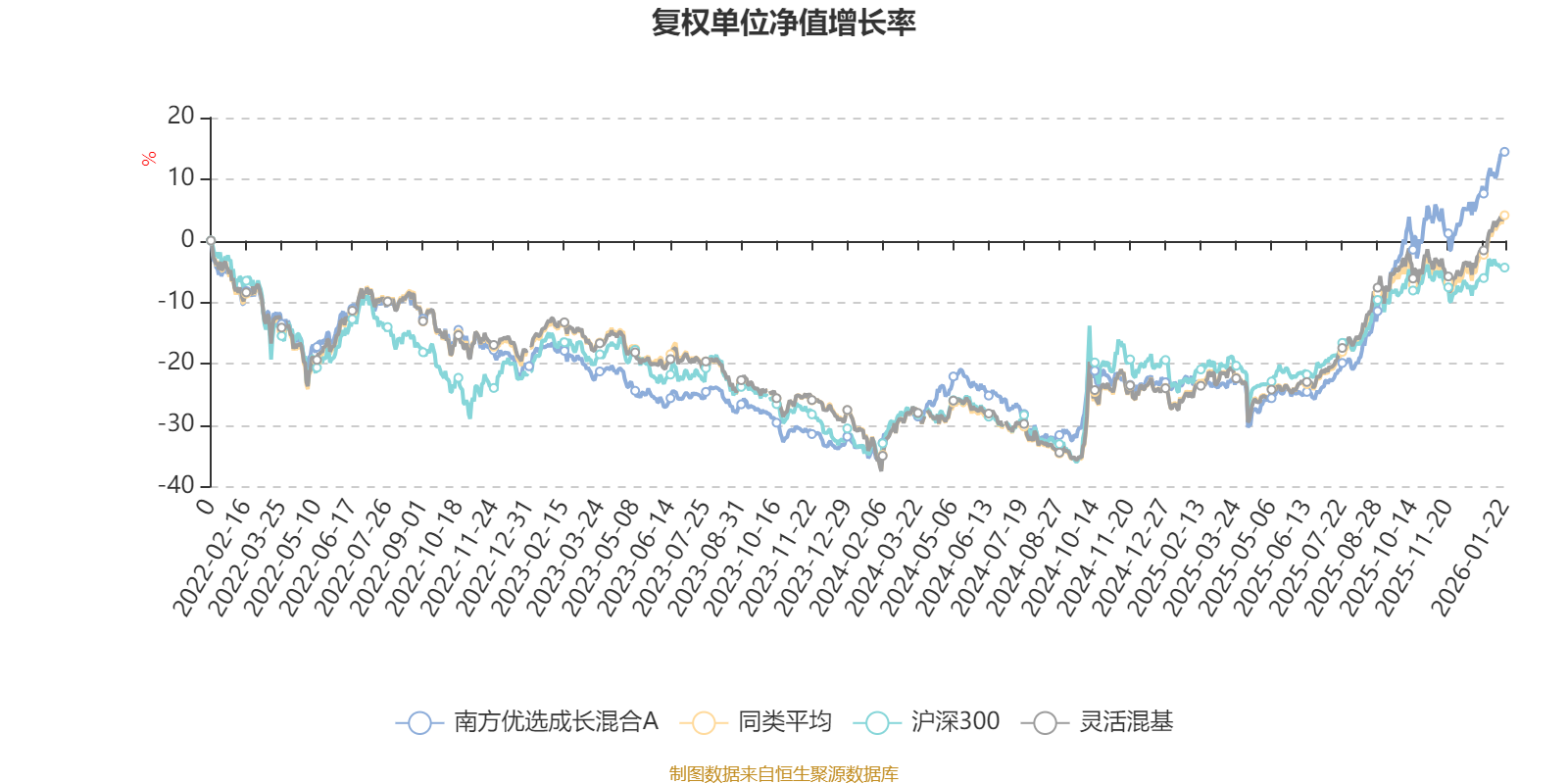 截至1月22日,南方优选成长混合A近三个月复权单位净值增长率为14.92%,位于同类可比基金291/1286;近半年复权单位净值增长率为42.88%,位于同类可比基金235/1286;近一年复权单位净值增长率为47.97%,位于同类可比基金360/1286;近三年复权单位净值增长率为38.10%,位于同类可比基金287/1286。