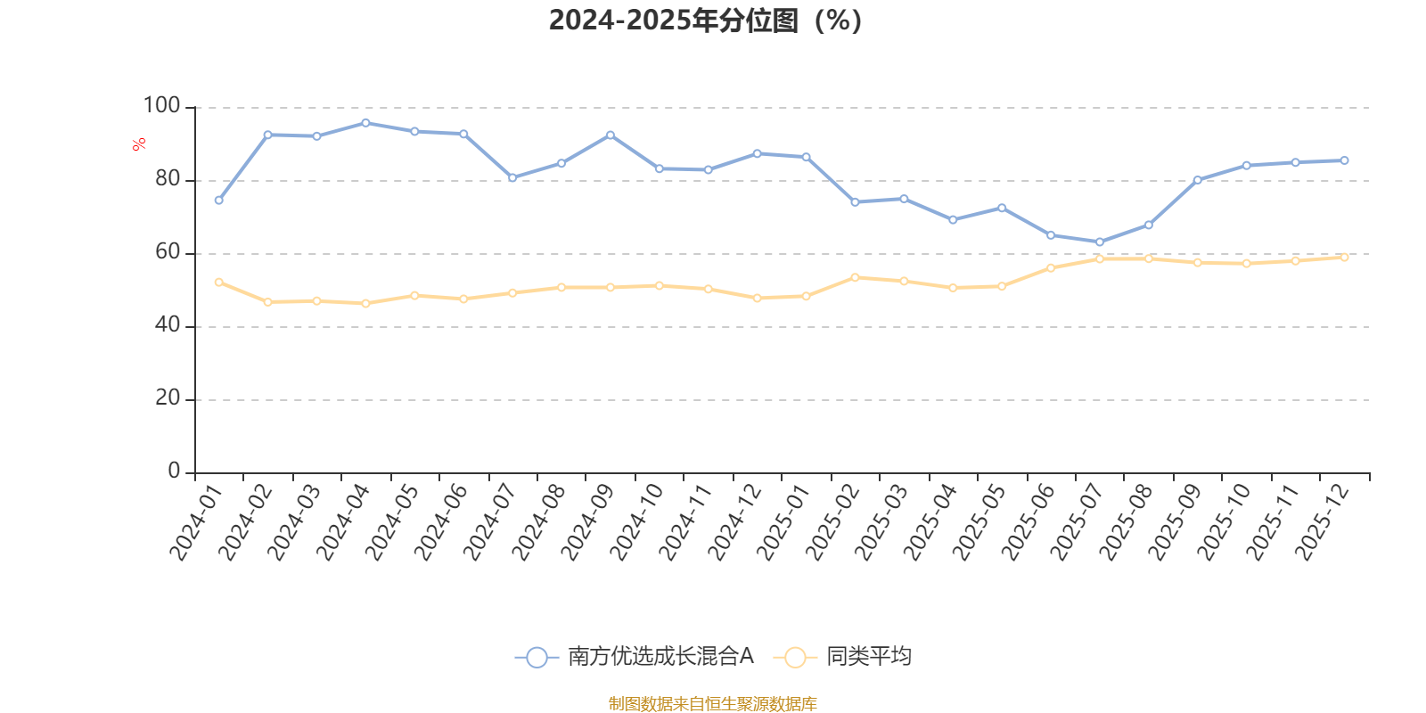 通过所选区间该基金净值增长率分位图,可以观察该基金与同类基金业绩比较情况。图为坐标原点到区间内某时点的净值增长率在同类基金中的分位数。