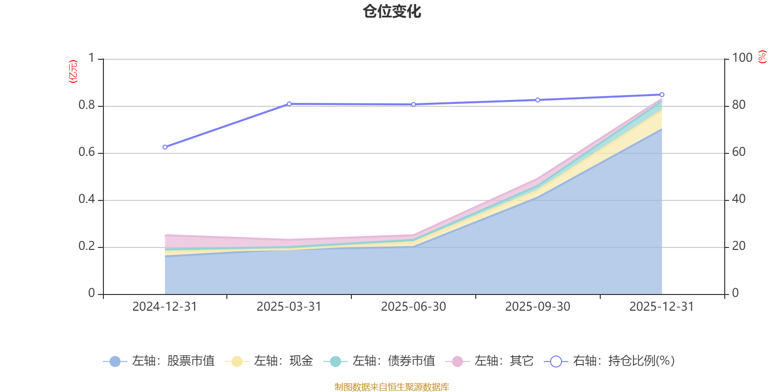 据定期报告数据统计,成立以来平均股票仓位为78.23%,同类平均为86.41%。2025年末基金达到84.79%的最高仓位,2024年末最低,为62.46%。