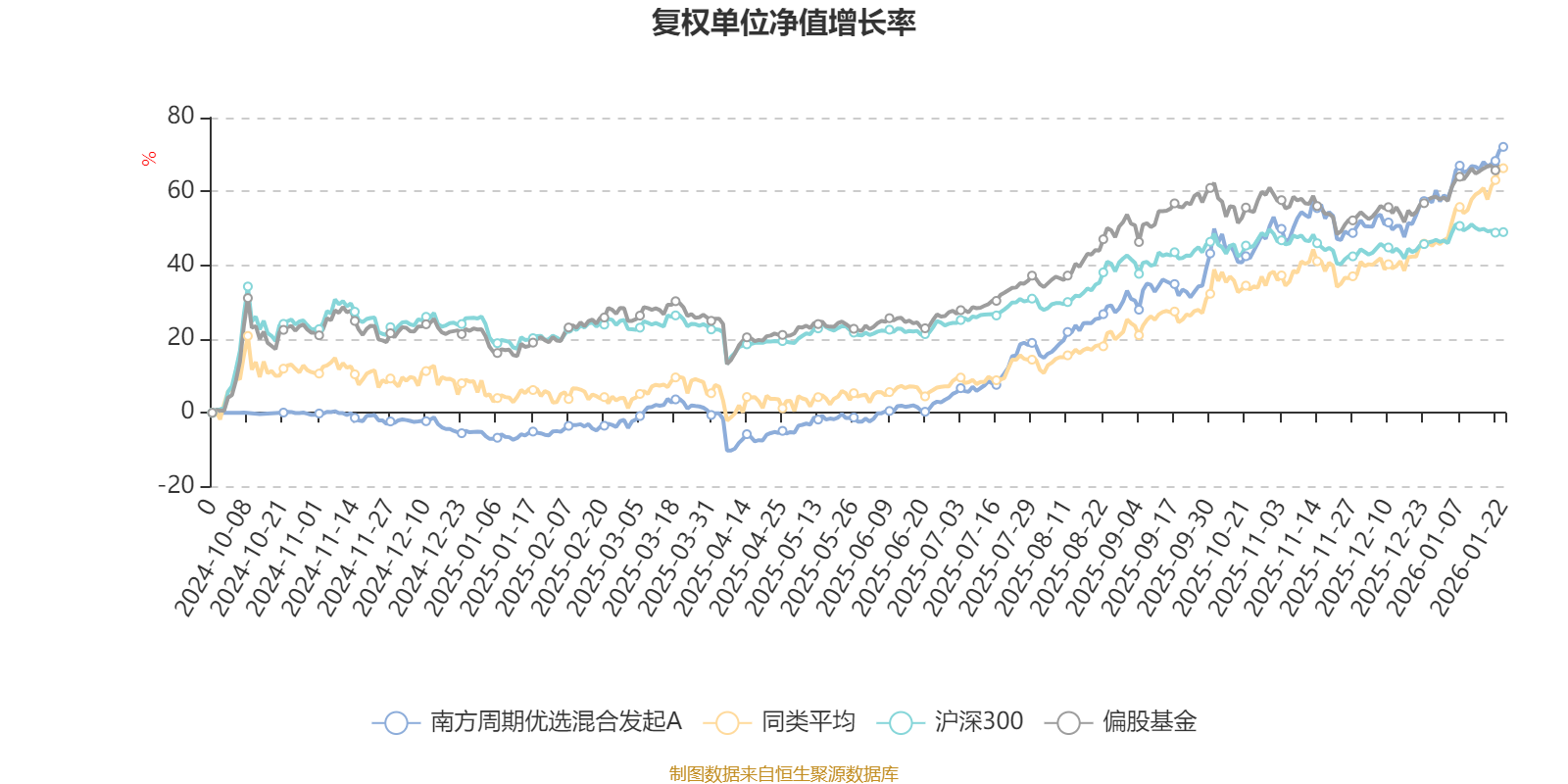 截至1月22日,南方周期优选混合发起A近三个月复权单位净值增长率为21.29%,位于同类可比基金26/49;近半年复权单位净值增长率为49.21%,位于同类可比基金22/49;近一年复权单位净值增长率为82.97%,位于同类可比基金18/46。