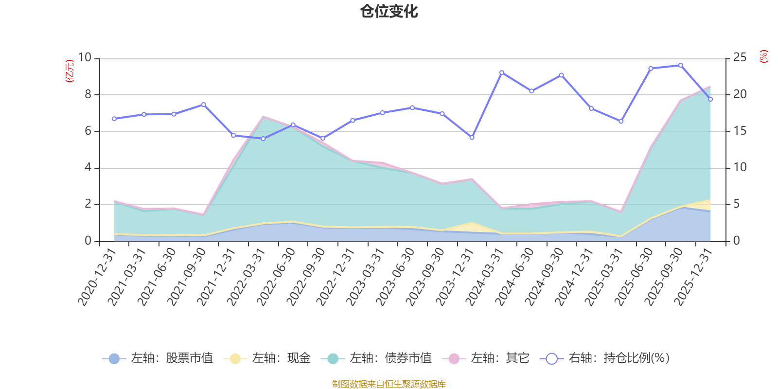 据定期报告数据统计,近三年平均股票仓位为19.62%,同类平均为19.2%。2025年三季度末基金达到24.06%的最高仓位,2022年一季度末最低,为14.04%。