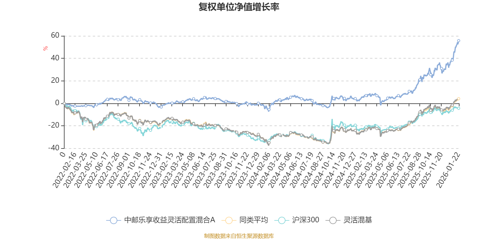 截至1月22日,中邮乐享收益灵活配置混合A近三个月复权单位净值增长率为24.75%,位于同类可比基金74/1286;近半年复权单位净值增长率为40.67%,位于同类可比基金258/1286;近一年复权单位净值增长率为47.57%,位于同类可比基金363/1286;近三年复权单位净值增长率为55.84%,位于同类可比基金151/1286。