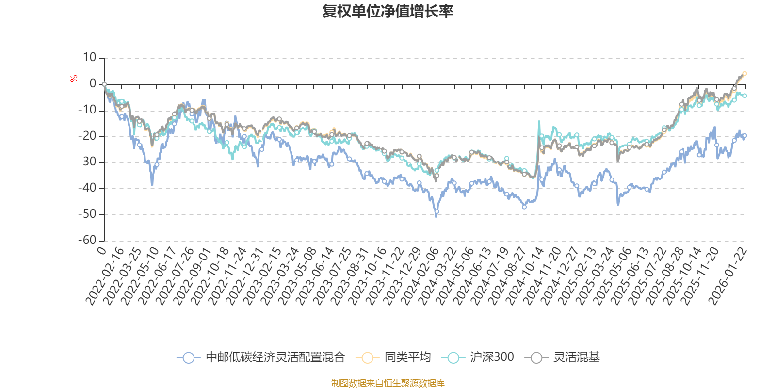 截至1月22日,中邮低碳经济灵活配置混合近三个月复权单位净值增长率为11.28%,位于同类可比基金490/1286;近半年复权单位净值增长率为21.06%,位于同类可比基金658/1286;近一年复权单位净值增长率为33.78%,位于同类可比基金620/1286;近三年复权单位净值增长率为-0.42%,位于同类可比基金1027/1286。