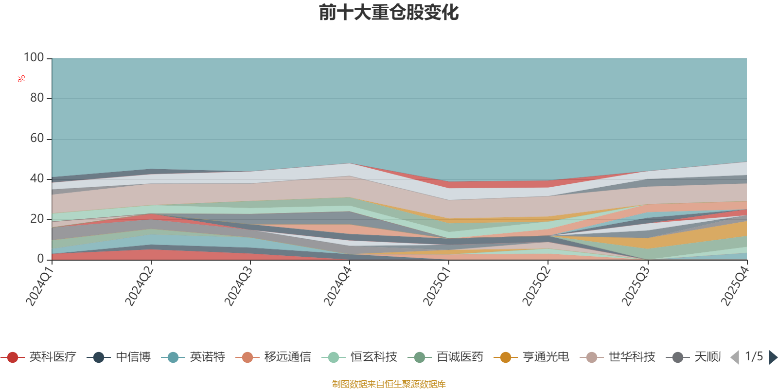 截至2025年四季度末,基金十大重仓股分别是东方电缆、寒武纪、阳光电源、鼎通科技、大金重工、三花智控、昭衍新药、世纪华通、海光信息、新泉股份。