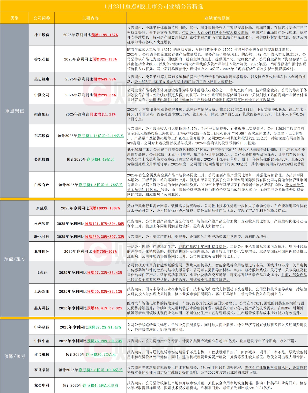 据财联社不完全统计,截至发稿,盘后包括神工股份、香农芯创、昊志机电、中微公司、招商银行、东芯股份、芯原股份、白银有色、新强联、永创智能、联化科技、亚钾国际、飞荣达、上海新阳、晶方科技、中科星图、中国中冶、建设机械、双良节能、龙芯中科等多家A股上市公司发布2025年业绩预告或业绩快报。其中,香农芯创公告,2025年净利同比预增82%-135%,企业级存储产品销售数量增长。4连板白银有色公告,预计2025年净亏损4.5亿元-6.75亿元。