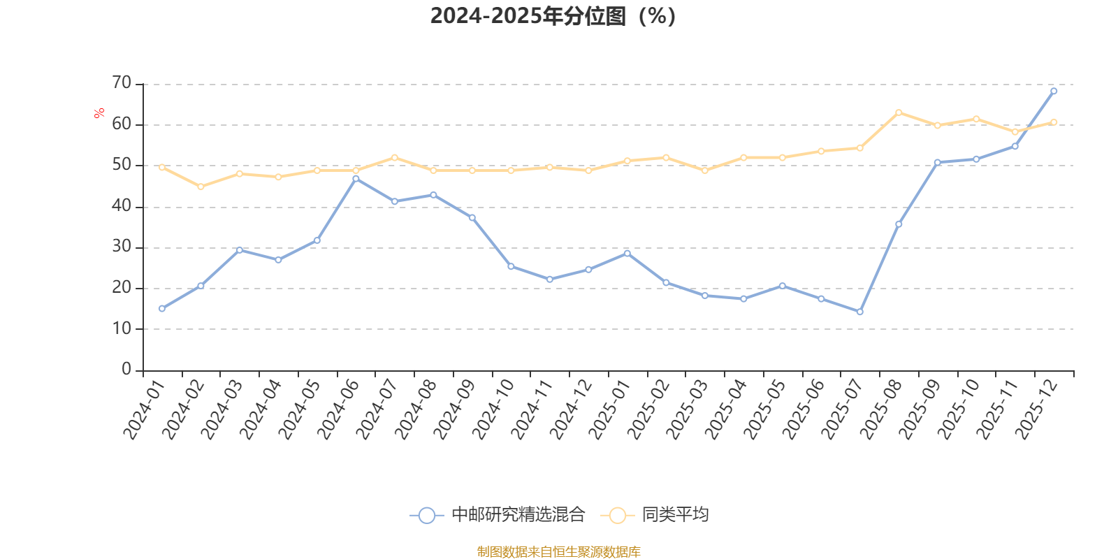 通过所选区间该基金净值增长率分位图,可以观察该基金与同类基金业绩比较情况。图为坐标原点到区间内某时点的净值增长率在同类基金中的分位数。