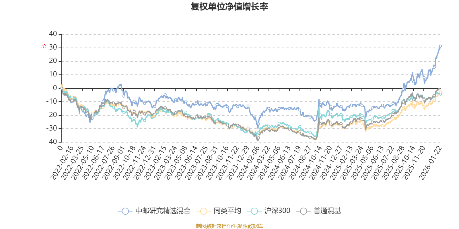 截至1月22日,中邮研究精选混合近三个月复权单位净值增长率为26.39%,位于同类可比基金3/134;近半年复权单位净值增长率为47.93%,位于同类可比基金6/134;近一年复权单位净值增长率为51.80%,位于同类可比基金19/131;近三年复权单位净值增长率为40.78%,位于同类可比基金18/124。