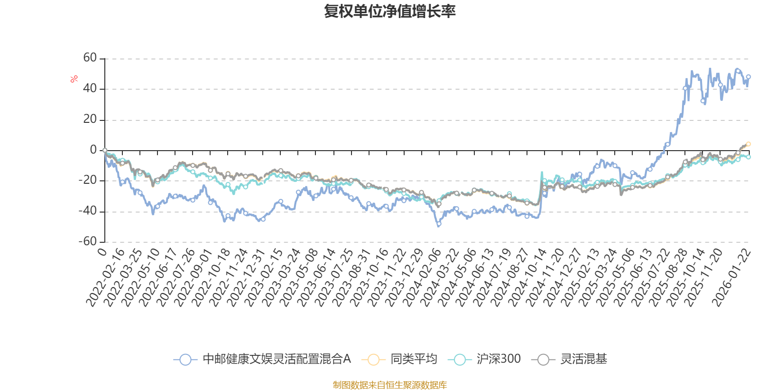 截至1月22日,中邮健康文娱灵活配置混合A近三个月复权单位净值增长率为8.00%,位于同类可比基金685/1286;近半年复权单位净值增长率为42.50%,位于同类可比基金245/1286;近一年复权单位净值增长率为73.36%,位于同类可比基金102/1286;近三年复权单位净值增长率为143.81%,位于同类可比基金10/1286。