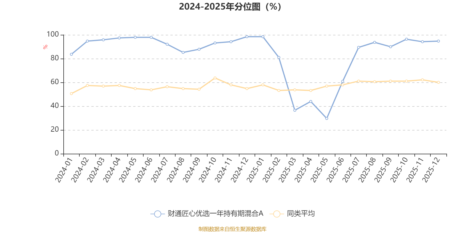 通过所选区间该基金净值增长率分位图,可以观察该基金与同类基金业绩比较情况。图为坐标原点到区间内某时点的净值增长率在同类基金中的分位数。