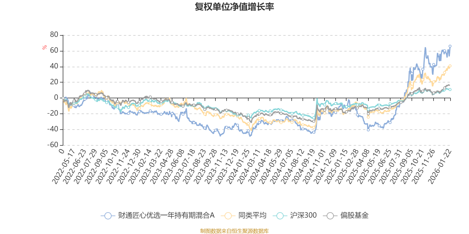 截至1月22日,财通匠心优选一年持有期混合A近三个月复权单位净值增长率为20.45%,位于同类可比基金45/229;近半年复权单位净值增长率为84.61%,位于同类可比基金10/229;近一年复权单位净值增长率为68.94%,位于同类可比基金83/222;近三年复权单位净值增长率为103.97%,位于同类可比基金24/165。