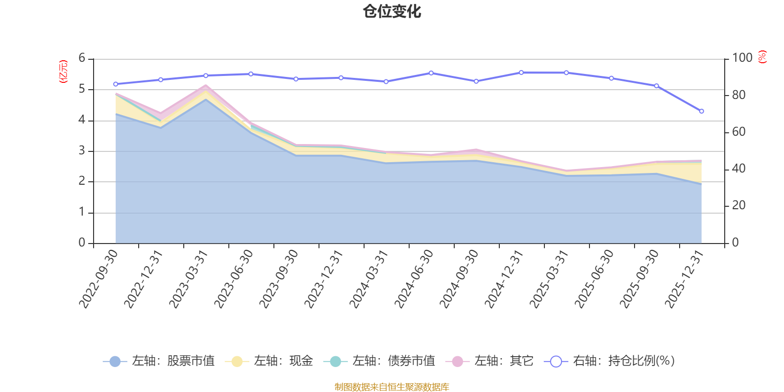 据定期报告数据统计,近三年平均股票仓位为88.39%,同类平均为72.57%。2024年末基金达到92.58%的最高仓位,2025年末最低,为71.61%。