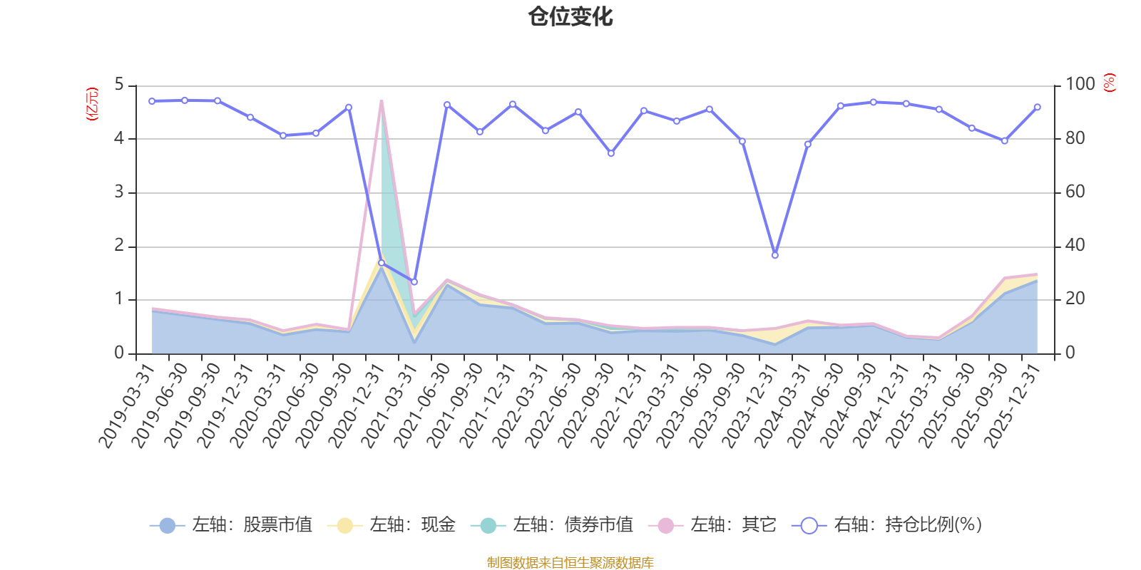 据定期报告数据统计,近三年平均股票仓位为83.17%,同类平均为72.57%。2019年上半年末基金达到94.46%的最高仓位,2021年一季度末最低,为26.8%。