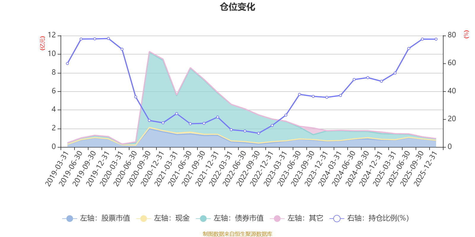 据定期报告数据统计,近三年平均股票仓位为49.51%,同类平均为67.52%。2019年末基金达到77.9%的最高仓位,2022年三季度末最低,为9.94%。