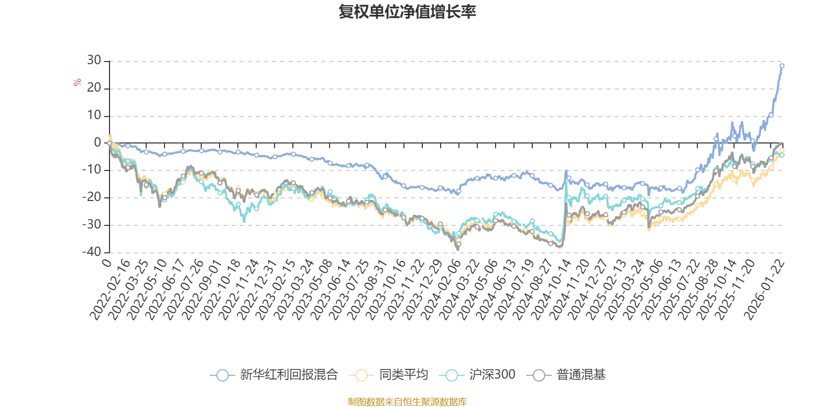 截至1月22日,新华红利回报混合近三个月复权单位净值增长率为25.01%,位于同类可比基金4/134;近半年复权单位净值增长率为42.13%,位于同类可比基金14/134;近一年复权单位净值增长率为52.02%,位于同类可比基金18/131;近三年复权单位净值增长率为33.78%,位于同类可比基金31/124。