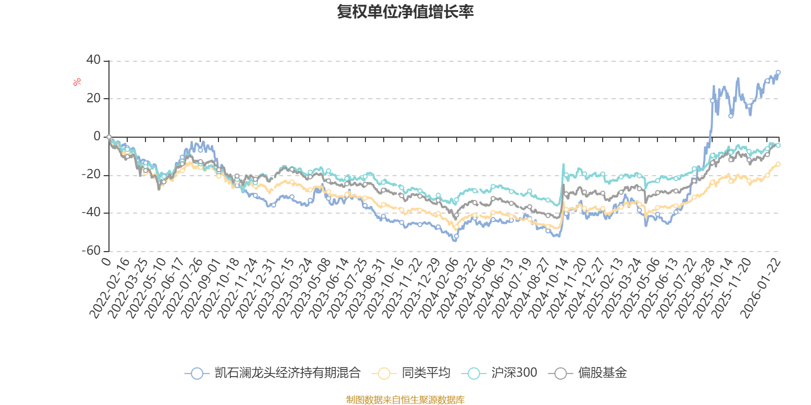 截至1月22日,凯石澜龙头经济持有期混合近三个月复权单位净值增长率为10.96%,位于同类可比基金285/689;近半年复权单位净值增长率为73.13%,位于同类可比基金13/689;近一年复权单位净值增长率为107.48%,位于同类可比基金9/673;近三年复权单位净值增长率为93.26%,位于同类可比基金4/396。