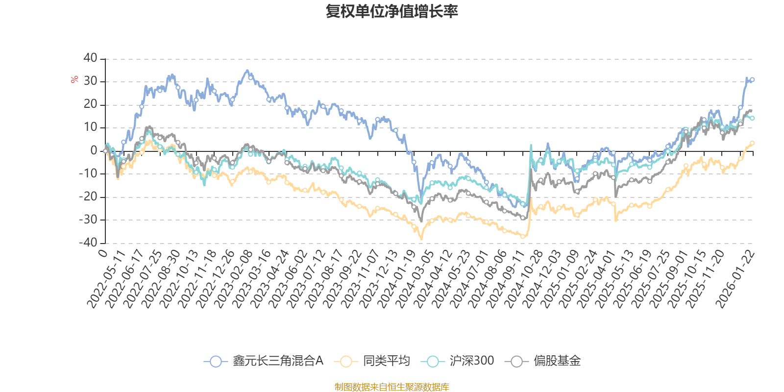 截至1月22日,鑫元长三角混合A近三个月复权单位净值增长率为16.12%,位于同类可比基金142/689;近半年复权单位净值增长率为29.91%,位于同类可比基金247/689;近一年复权单位净值增长率为40.08%,位于同类可比基金313/673;近三年复权单位净值增长率为-2.06%,位于同类可比基金306/396。