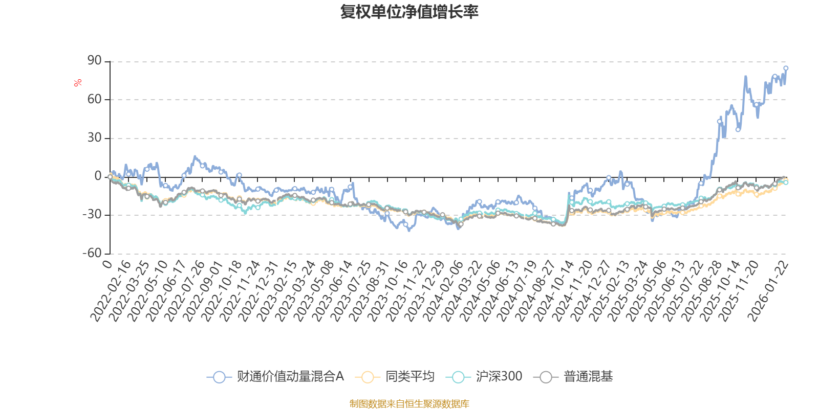 截至1月22日,财通价值动量混合A近三个月复权单位净值增长率为22.90%,位于同类可比基金7/134;近半年复权单位净值增长率为94.42%,位于同类可比基金1/134;近一年复权单位净值增长率为76.33%,位于同类可比基金7/131;近三年复权单位净值增长率为106.40%,位于同类可比基金1/124。
