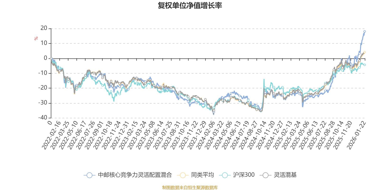 截至1月22日,中邮核心竞争力灵活配置混合近三个月复权单位净值增长率为27.65%,位于同类可比基金52/1286;近半年复权单位净值增长率为50.86%,位于同类可比基金145/1286;近一年复权单位净值增长率为56.87%,位于同类可比基金245/1286;近三年复权单位净值增长率为38.00%,位于同类可比基金290/1286。