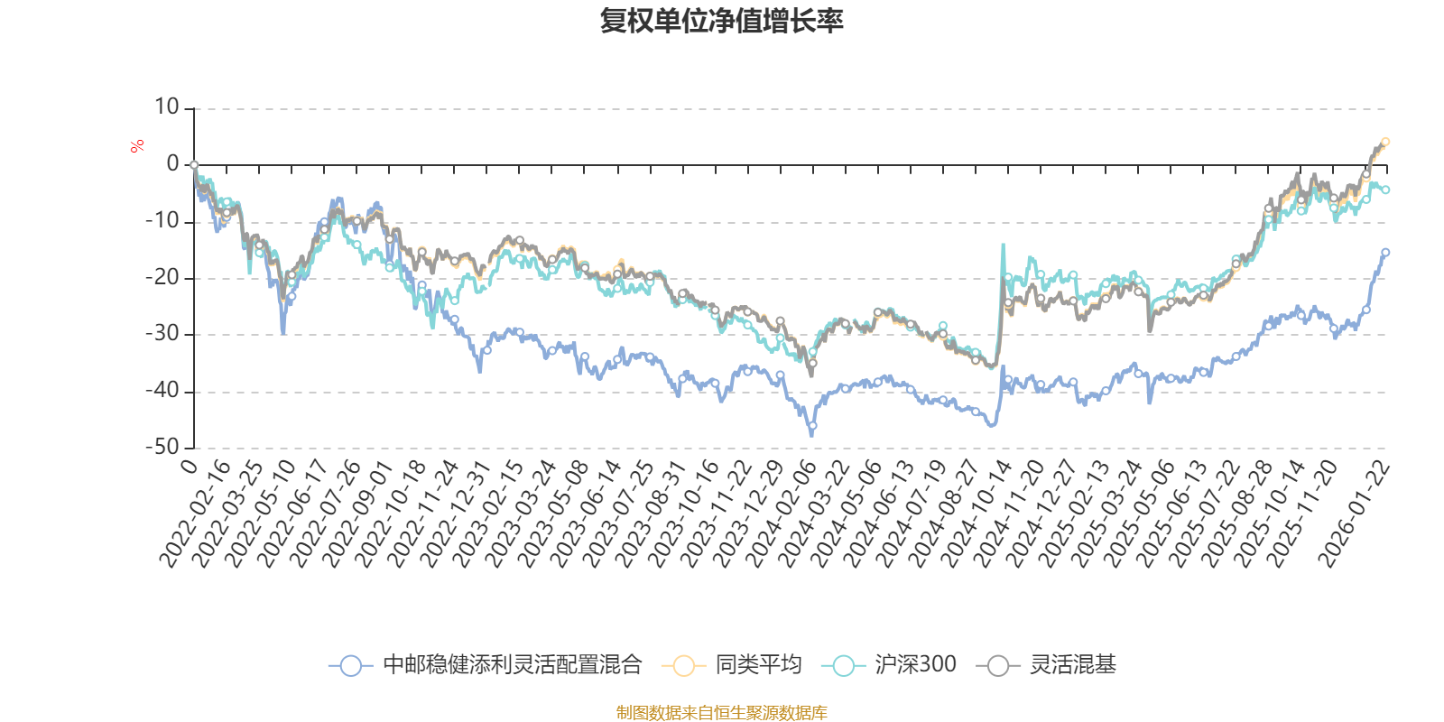 截至1月22日,中邮稳健添利灵活配置混合近三个月复权单位净值增长率为16.60%,位于同类可比基金224/1286;近半年复权单位净值增长率为27.78%,位于同类可比基金482/1286;近一年复权单位净值增长率为42.76%,位于同类可比基金456/1286;近三年复权单位净值增长率为21.81%,位于同类可比基金524/1286。