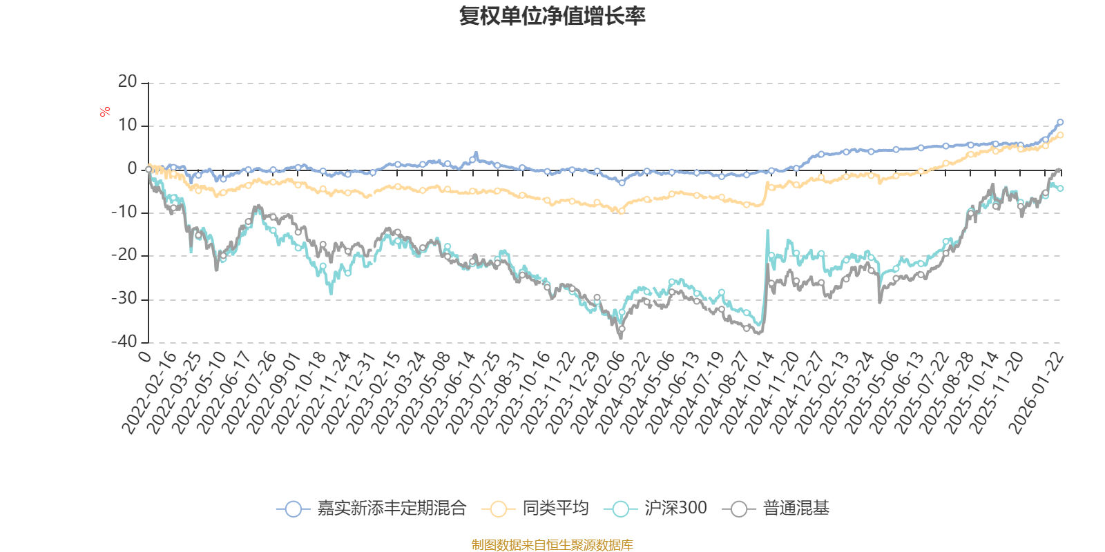 截至1月22日,嘉实新添丰定期混合近三个月复权单位净值增长率为4.88%,位于同类可比基金81/670;近半年复权单位净值增长率为5.23%,位于同类可比基金252/670;近一年复权单位净值增长率为6.98%,位于同类可比基金358/669;近三年复权单位净值增长率为10.05%,位于同类可比基金345/597。
