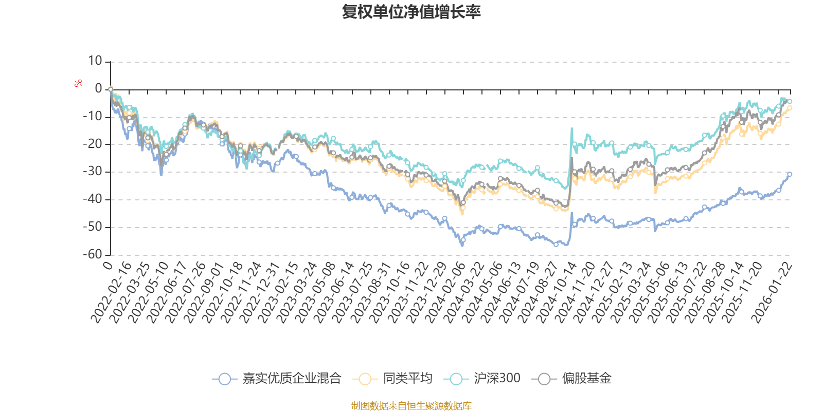 截至1月22日,嘉实优质企业混合近三个月复权单位净值增长率为11.60%,位于同类可比基金60/185;近半年复权单位净值增长率为20.63%,位于同类可比基金107/185;近一年复权单位净值增长率为37.46%,位于同类可比基金103/183;近三年复权单位净值增长率为-10.74%,位于同类可比基金163/176。