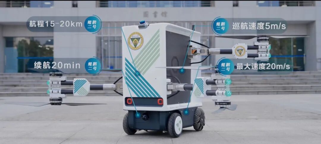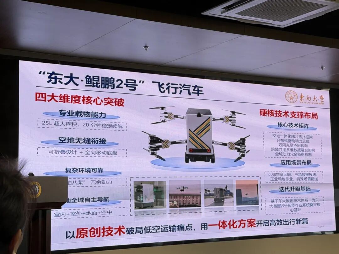 相较于一年前发布的“鲲鹏1号”,这款“升级版”更轻便小巧,机臂可折叠,可更自由、灵活地切换飞行、行驶等不同模式。殷国栋教授介绍,“鲲鹏2号”并非简单的外观迭代,而是针对规模化商用场景的重新定义,更是对国家发展改革委关于低空经济发展方向提出的“先载货后载人、先隔离后融合、先远郊后城区”十八字方针的积极响应。