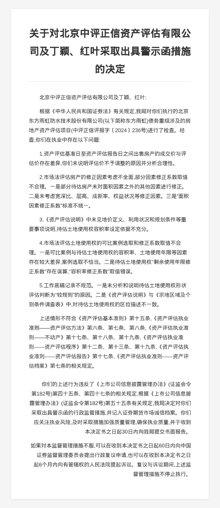 决定书显示,北京中评正信资产评估有限公司在执行北京东方雨虹防水技术股份有限公司债务重组涉及的房地产资产评估项目中,存在以下问题: