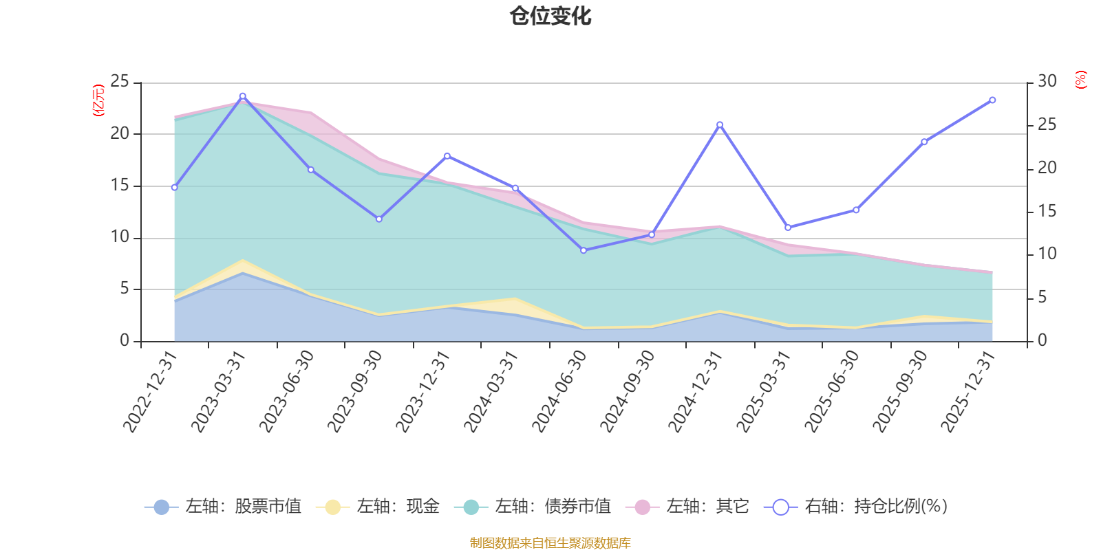 据定期报告数据统计,近三年平均股票仓位为19.11%,同类平均为19.2%。2023年一季度末基金达到28.43%的最高仓位,2024年上半年末最低,为10.54%。