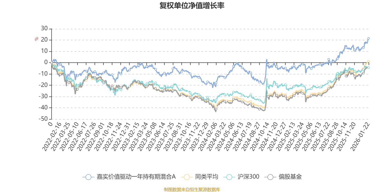 截至1月22日,嘉实价值驱动一年持有期混合A近三个月复权单位净值增长率为8.38%,位于同类可比基金61/130;近半年复权单位净值增长率为17.91%,位于同类可比基金85/130;近一年复权单位净值增长率为28.80%,位于同类可比基金84/130;近三年复权单位净值增长率为25.03%,位于同类可比基金54/125。
