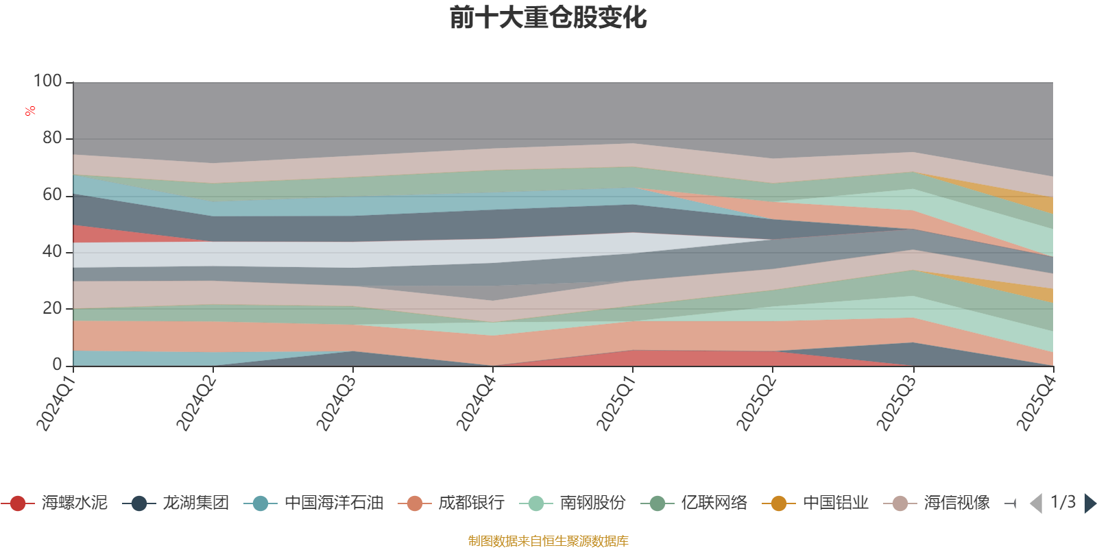 该基金持股集中度较高,近2年前十大重仓股集中度长期超过60%。截至2025年四季度末,基金十大重仓股分别是亿联网络、紫金矿业、纽威股份、南钢股份、九号公司、招商银行、海信视像、柳工、中国铝业、成都银行。