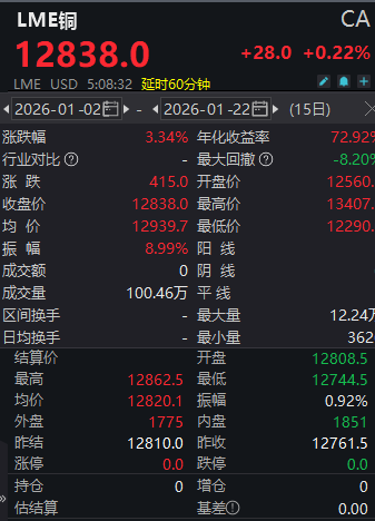 Wind数据显示,截至北京时间1月22日14时08分,LME铜报12838美元/吨,涨0.22%,年内累计涨幅为3.34%。