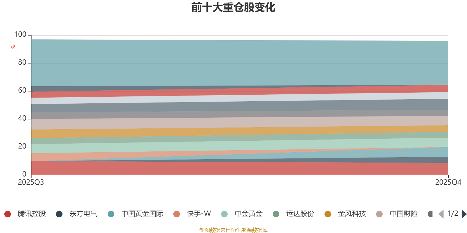 该基金持股集中度较高。截至2025年四季度末,基金十大重仓股分别是腾讯控股、宏创控股、中国黄金国际、中国财险、中金黄金、中国人民保险集团、兴业银锡、金风科技、东方电气、中国人保、运达股份。
