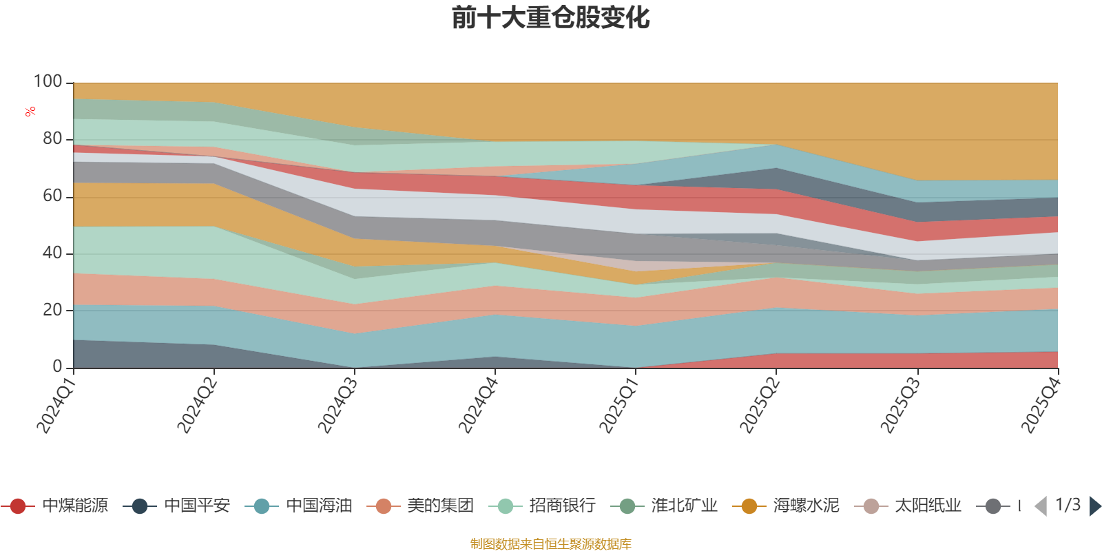 该基金持股集中度较高,近2年前十大重仓股集中度长期超过60%。截至2025年四季度末,基金十大重仓股分别是中国海油、宁波银行、美的集团、海尔智家、晋控煤业、中煤能源、保利发展、淮北矿业、招商银行、山西焦煤。