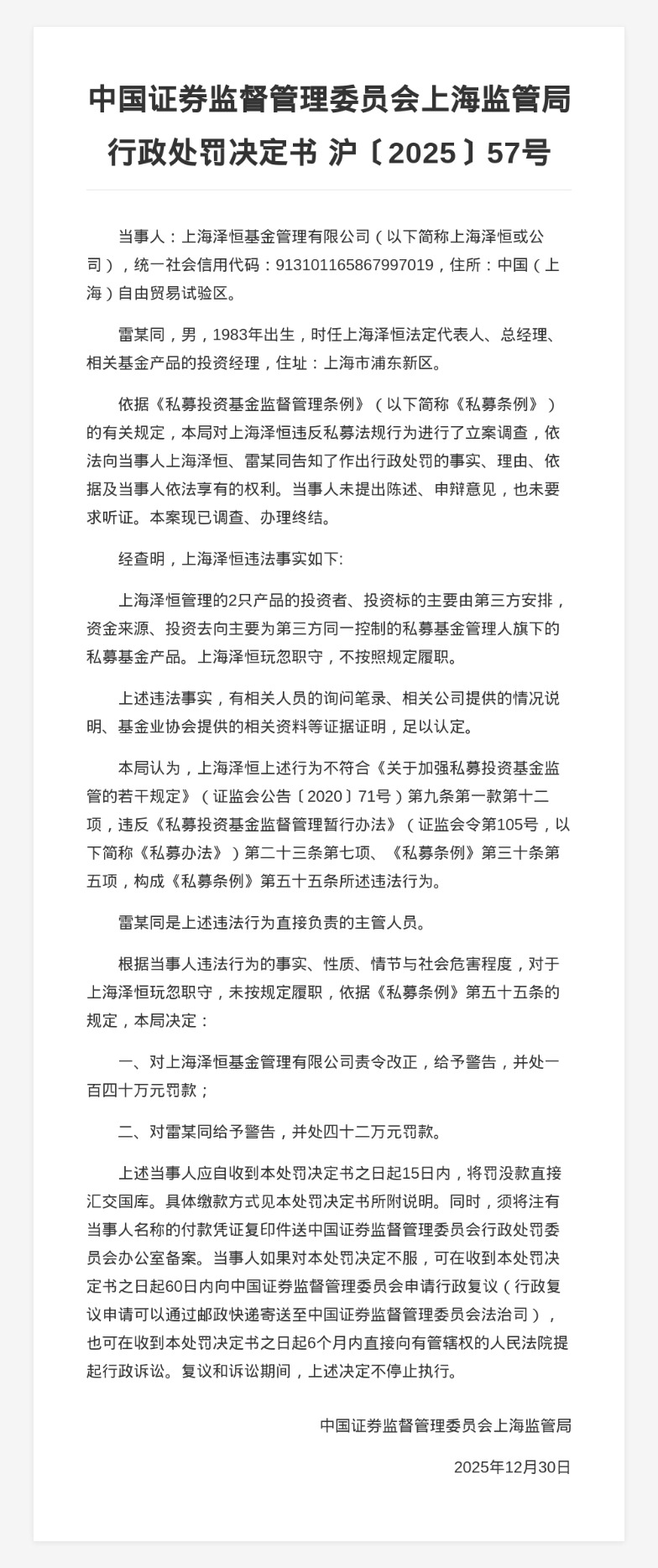 对此,中国证券监督管理委员会上海监管局决定对上海泽恒基金管理有限公司责令改正,给予警告,并处140万元罚款;对雷某同给予警告,并处42万元罚款。