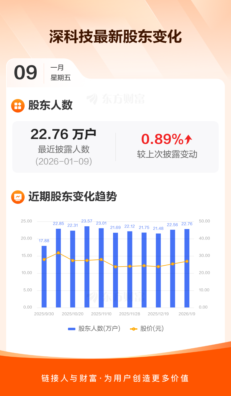 深科技:截至1月9日最新股东户数22.76万户,较上期增加0.89%