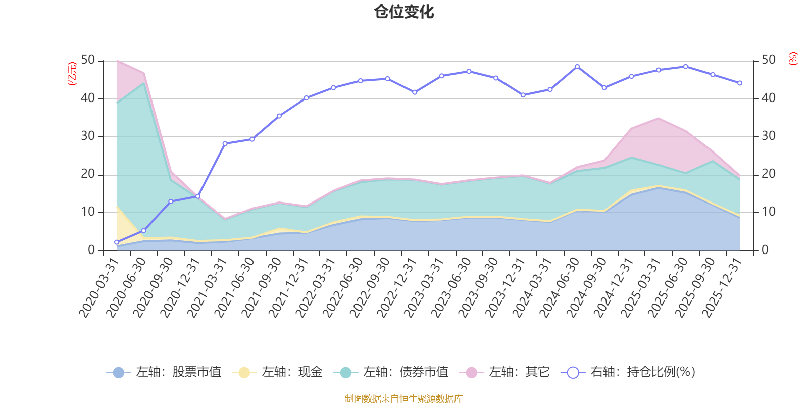 据定期报告数据统计,近三年平均股票仓位为45.46%,同类平均为19.2%。2025年上半年末基金达到48.45%的最高仓位,2020年一季度末最低,为2.24%。