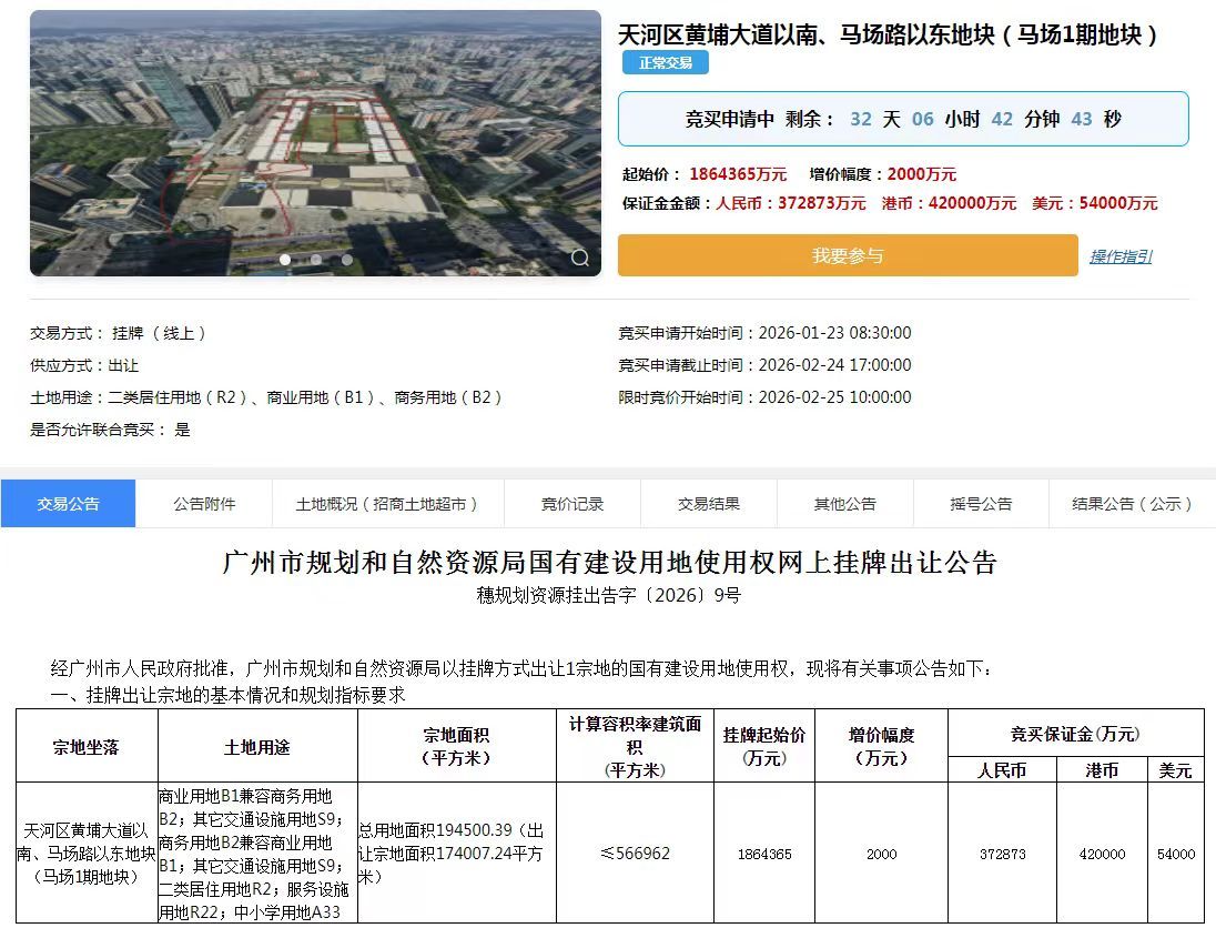 1月23日,备受瞩目的天河区马场(一期)地块正式挂牌出让,挂牌起始价为186.44亿元。